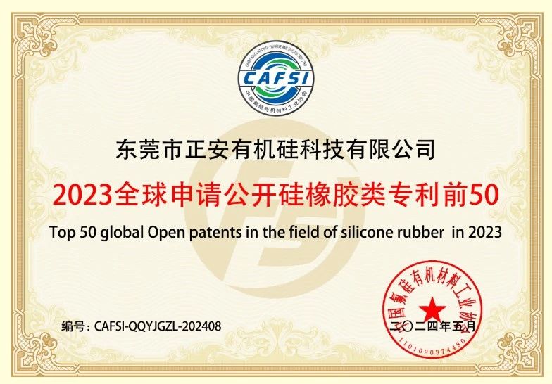 会議の表彰式で、Genvan Siliconeは、その優れた研究開発能力と革新的な成果により、「中国フルオロシリコン産業の革新的企業」に選ばれました。 会議はまた、「2023グローバルシリコーン特許分析レポート」を発表し、Genvanシリコーンは、2023年に国内シリコーンゴムメーカーの最前線にランクされ、世界のシリコーンゴムの公的特許トップ50にランクされました。